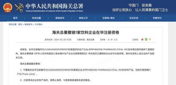 原來,這波退款潮緣起2月26日海關總署官網(wǎng)發(fā)布的一則公告。公告稱,經(jīng)核實,在華注冊編號為CUSA24092203180057的美國飲料生產(chǎn)企業(yè)JERRY&SONS PHARMACEUTICAL INC在申請注冊時提供了虛假材料,已撤銷該企業(yè)在華注冊資格,未發(fā)現(xiàn)該企業(yè)的產(chǎn)品報關記錄。海關總署提醒,消費者不要購買其飲料產(chǎn)品,包括天萁西梅汁(TiQ Prune Juice),請停止食用,與原獲取渠道聯(lián)系退貨事宜。