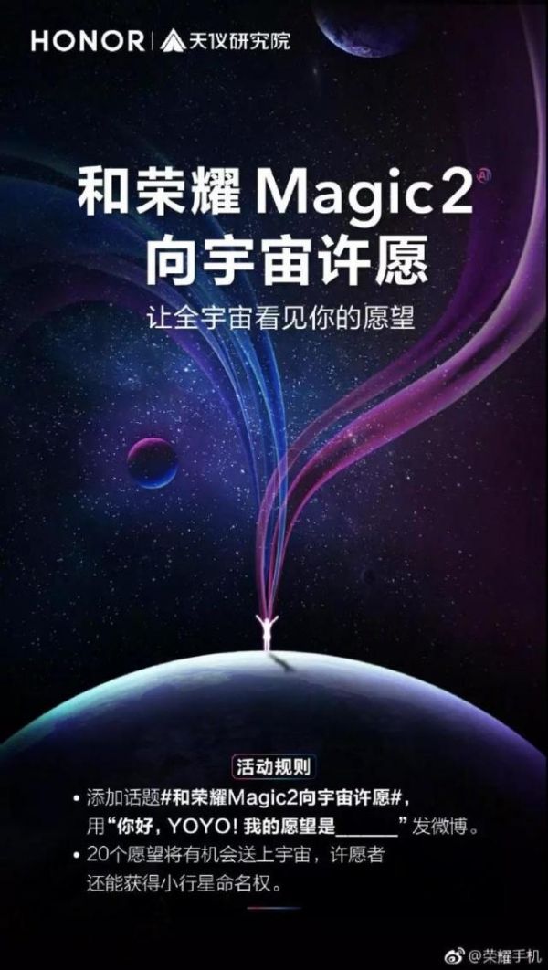 榮耀手機(jī)發(fā)起“和榮耀 Magic2 向宇宙許愿”的活動(dòng),用戶(hù)在微博上參與“你好,YOYO !我的愿望是____”的話題,聯(lián)合天儀研究院的衛(wèi)星,將會(huì)把入選的 20 個(gè)愿望鐫刻在芯片上發(fā)射去太空。用戶(hù)還有可能獲得小行星命名權(quán)。