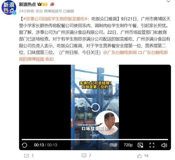 據(jù)新浪熱點(diǎn)視頻顯示“廣州一學(xué)校家長(zhǎng)反應(yīng)飯菜難吃,配餐公司使用凍肉、調(diào)制肉給學(xué)生制作午餐”引發(fā)關(guān)注,視頻中:在檢查的時(shí)候,廣州多滿分食品有限公司負(fù)責(zé)人表示,吃飯眾口難調(diào),對(duì)于學(xué)生營(yíng)養(yǎng)餐安全擺第一位,營(yíng)養(yǎng)擺第二位,口味擺第三位。