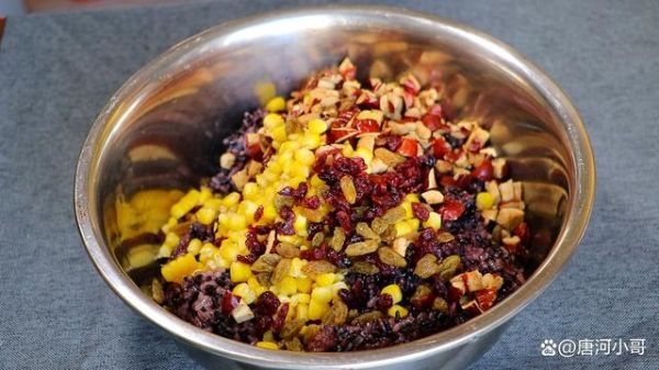 第二步:蒸熟之后我們將它取出,然后再把準備好的其他食材放進來,玉米粒、紅棗碎、葡萄干、蔓越莓干可以根據自己的喜好來定,如果喜歡吃的甜一點可以加一些白糖,最后加入糯米粉;充分給它混合均勻。