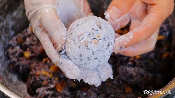 第三步:拌均勻之后給它團成大小合適的劑子,這個劑子我稱了一下,100克一個比較合適,提前準備一些餃子皮,然后將它搟薄,最后將它和剛才準備的黑米球給它包起來,包至的手法也特別的簡單,只要是里邊的餡料不漏出來就可以了。