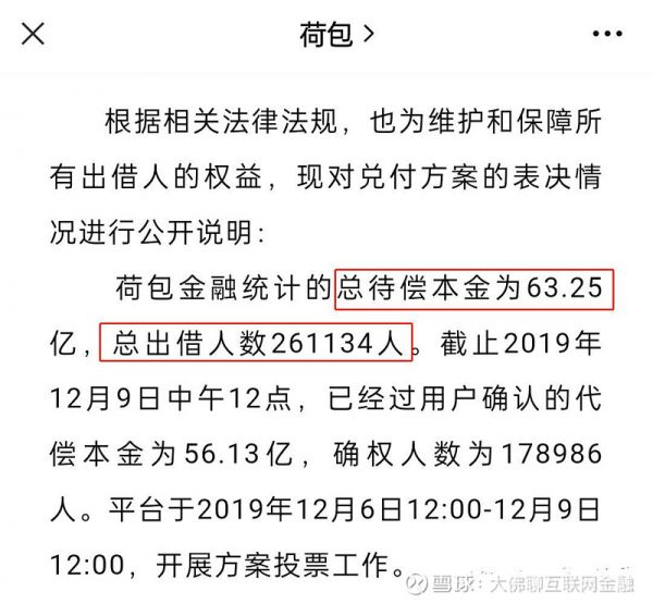 2019年11月荷包金融宣布退出網(wǎng)貸業(yè)務(wù),同年12月宣布兌付方案。據(jù)荷包金融統(tǒng)計的總待償還本金為63.25億元,總出借人數(shù)超過26萬人。