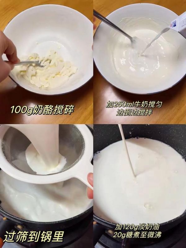 :過篩到空鍋里,過篩子是讓口感更加細膩,再繼續(xù)加入120g淡奶油20g白砂糖,開火煮至微微沸就行,不要狠煮;