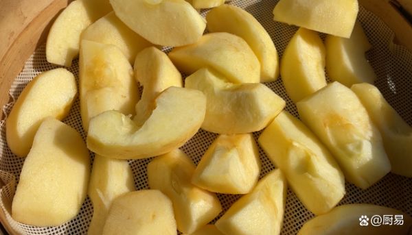 1、蘋果表面有許多的灰塵,我們要加清水多搓洗干凈。蘋果皮用削皮刀削掉,這有個(gè)別的都開始要起爛斑了,一個(gè)一個(gè)都削好,把蘋果對(duì)半切開,再分成三半,個(gè)頭小的蘋果我們一個(gè)蘋果分四塊即可,不要切的太薄了,那樣成品的口感會(huì)差些,這中間的蘋果核和兩頭的蒂要清理干凈了,都切好,把蘋果塊鋪放好到蒸籠里。