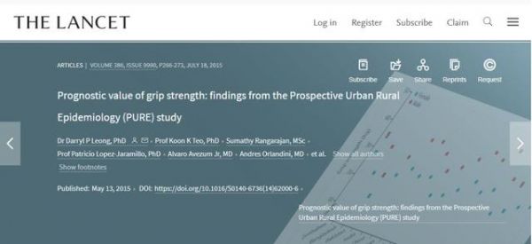 2015年柳葉刀的PURE(前瞻性城鄉(xiāng)流行病學(xué)研究,屬于大型縱向人口研究)研究中,研究人員對17個(gè)不同收入國家,142856名,35-70歲的成年人,進(jìn)行了握力測試和平均4年的跟蹤回訪。②