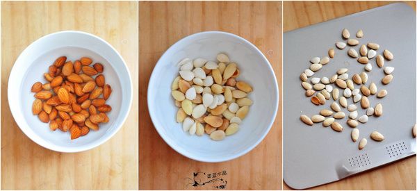 1.兩種杏仁去殼,浸泡在水里,最好隔夜。