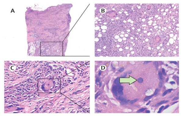 狒狒巴拉姆希阿米巴感染主要侵犯皮膚及神經(jīng)系統(tǒng)。皮膚損害好發(fā)于面部,其次為膝蓋部位。皮膚表現(xiàn)為無(wú)癥狀性的斑塊,界限清楚,周邊輕微隆起,潰瘍罕見(jiàn),皮疹部位感覺(jué)正常。神經(jīng)系統(tǒng)的癥狀無(wú)特異性,可有頭痛、發(fā)熱、惡心、嘔吐、嗜睡、意識(shí)和語(yǔ)言障礙等癥狀。需要注意不同國(guó)家的患者在臨床表現(xiàn)上有所不同,美國(guó)的患者通常直接發(fā)展為肉芽腫性腦炎,迅速死亡,僅有5%的患者有皮膚上的表現(xiàn),而在秘魯和中國(guó)的患者大多數(shù)首先表現(xiàn)為皮膚慢性肉芽腫,然后發(fā)展成致死性肉芽腫性腦炎,腦部損害出現(xiàn)的時(shí)間約在皮膚表現(xiàn)出現(xiàn)后的半年到9年。皮膚組織病理表現(xiàn)為深在的肉芽腫反應(yīng),浸潤(rùn)的細(xì)胞主要為淋巴細(xì)胞、漿細(xì)胞、多核巨細(xì)胞及散在嗜酸性粒細(xì)胞。(1)需要注意的是阿米巴滋養(yǎng)體在組織病理上與組織細(xì)胞十分類似,鑒別十分困難。