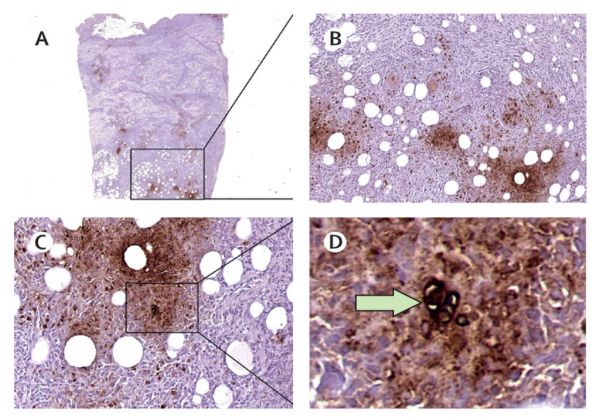 2患者皮膚組織免疫組化,箭頭所指為狒狒巴拉姆希阿米巴包囊。