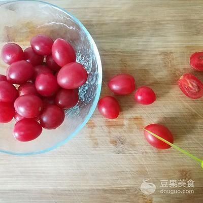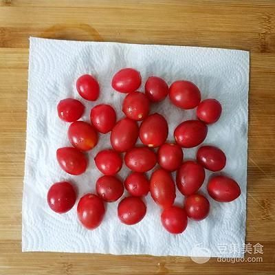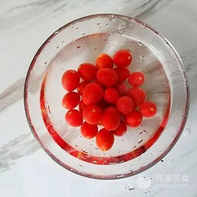 1、櫻桃番茄去蒂洗凈,在鹽水里泡一會(huì)。