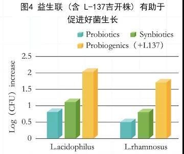 熱滅活L-137 吉開株 (后生元) 通過(guò)胃酸后,直接經(jīng)由小腸微皺褶細(xì)胞吸收,迅速反應(yīng)于免疫細(xì)胞,藉由脂壁酸刺激 IL-12的分泌[6]和激活第一型干擾素生成[7],強(qiáng)化免疫防護(hù)力。研究證實(shí),熱滅活L-137吉開株能透過(guò)激活免疫因子IL-12和 IFN-γ[8],打造好的腸道環(huán)境,有效輔助好菌定殖[9],抑制壞菌生長(zhǎng),若能結(jié)合益生菌、益生元形成「益生聯(lián)」體系,好菌更能大幅生長(zhǎng) (圖4),如同魚幫水,水幫魚的相輔相成;微生態(tài)平衡后,又能增進(jìn)腸道絨毛的吸收能力,提升營(yíng)養(yǎng)吸收,幫助健康維護(hù)、發(fā)育成長(zhǎng)[8],提高整體生活質(zhì)量[10]。