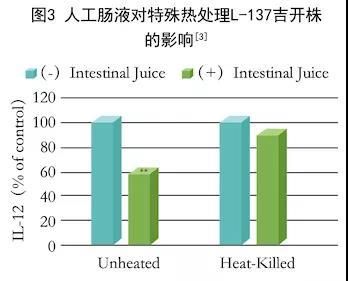 后生元發(fā)揮效力的關(guān)鍵取決于優(yōu)質(zhì)的菌株、培育過(guò)程以及熱封存條件。研究顯示,篩選過(guò)的菌株,經(jīng)由特殊培育及熱封存技術(shù)處理,它們的免疫激活能力遠(yuǎn)優(yōu)于一般菌株,日本發(fā)現(xiàn)經(jīng)特殊熱滅活程序的植物乳桿菌L-137 (Lactobacillus plantarum L-137),又名 L-137 吉開株的表現(xiàn)較為突出 (圖2),即便采取破壞性實(shí)驗(yàn),經(jīng)高溫加熱或腸胃消化液處理后,仍保有高度生理活性 (圖3)[3]。