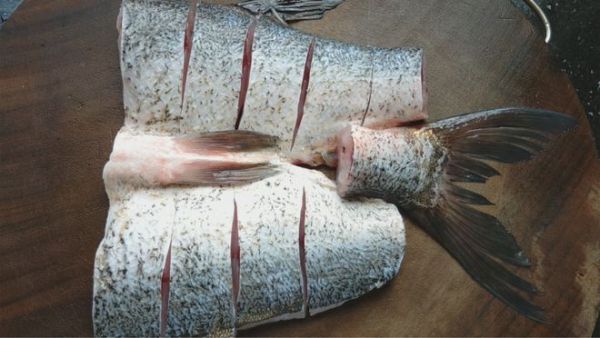 第一步:先準(zhǔn)備一塊魚腩,今天沒(méi)買到好魚腩,挑了一條魚取下兩塊魚腩,魚頭用來(lái)煲湯了,把魚腩處理干凈后瀝干水分,也可以用廚房用紙擦干一點(diǎn),然后再把魚腩切塊,稍微大塊一點(diǎn)。