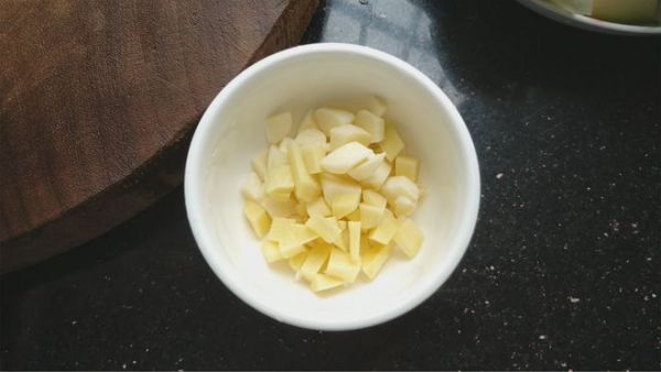 第三步:準(zhǔn)備一塊姜,把姜去皮后洗凈后切成粒備用,再準(zhǔn)備5瓣大蒜頭,去皮洗凈后也切成粒備用。