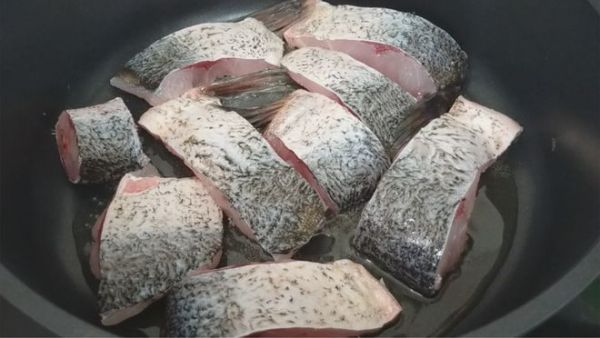 第四步:現(xiàn)在我們來(lái)煎魚,煎魚有一個(gè)小技巧,掌握好了,煎出來(lái)的魚皮不破,也不粘鍋,大家要注意看了哦。鍋中下油,加入少許的鹽,把油燒熱后調(diào)小火,再把準(zhǔn)備好的魚塊擺進(jìn)去煎,魚塊擺進(jìn)去后不要隨意翻動(dòng),中小火慢慢煎,把一面先煎至金黃,再翻面煎,翻面前再均勻撒入少許的鹽,把魚兩面都煎至金黃。