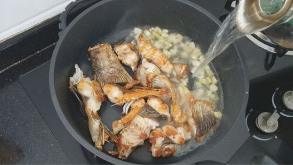 第五步:魚塊煎好后,把它們弄到一邊,鍋中空出一點(diǎn)點(diǎn)位置,倒入姜蒜粒,把它煸出香味,煸出香味后,倒入兩碗開(kāi)水。