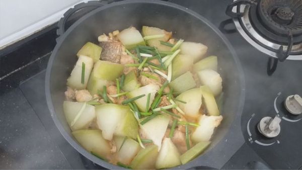 第八步:時(shí)間差不多了,打開(kāi)鍋蓋,撒上一點(diǎn)胡椒粉,再把準(zhǔn)備好的蔥段放進(jìn)去,可以輕輕攪拌一下,然后就關(guān)火出鍋開(kāi)吃吧,這一道冬瓜燜魚腩就做好了,喜歡的朋友可以試試,做法配料都很簡(jiǎn)單,魚肉煎過(guò)后沒(méi)一點(diǎn)腥味,吃著很香,冬瓜鮮甜多汁,搭配著魚汁吃更鮮美,超下飯哦。