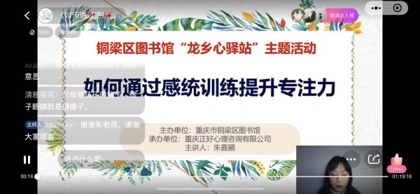坐下學(xué)習(xí)不到2分鐘,一會(huì)兒喝水,一會(huì)兒上廁所,一會(huì)兒玩橡皮擦……這段時(shí)間,不少家長看到孩子學(xué)習(xí)的過程后,都紛紛表示頭疼。12月12日,銅梁區(qū)圖書館攜手重慶正好心理咨詢有限公司舉辦了《如何通過感統(tǒng)訓(xùn)練提升專注力》線上直播講座,幫助廣大兒童及特殊兒童的家長對(duì)孩子進(jìn)行感統(tǒng)訓(xùn)練,有效提升孩子的專注力。