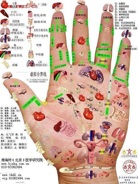 手部有6條經(jīng)脈循行與全身各臟腑組織、器官溝通。大約有99個穴位(區(qū))可以反映全身五臟六腑的健康狀況與全身各臟腑組織、器官溝通。
