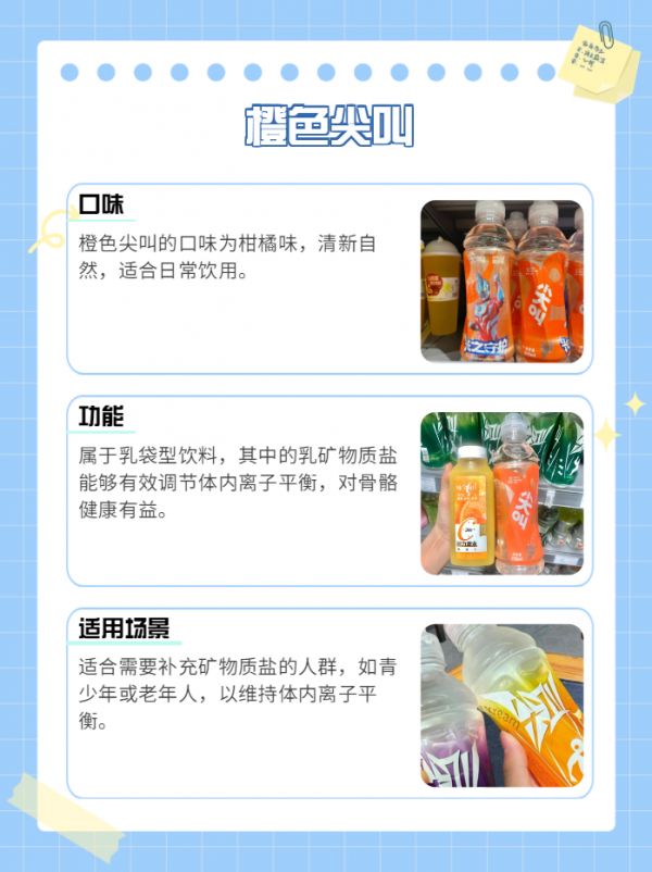 橙色尖叫口味:柑橘味功能:屬于乳袋型,其中的乳礦物質(zhì)鹽能夠調(diào)節(jié)體內(nèi)離子平衡,對骨骼有益。適用場景:適合需要補充礦物質(zhì)鹽的人群,如青少年或老年人。