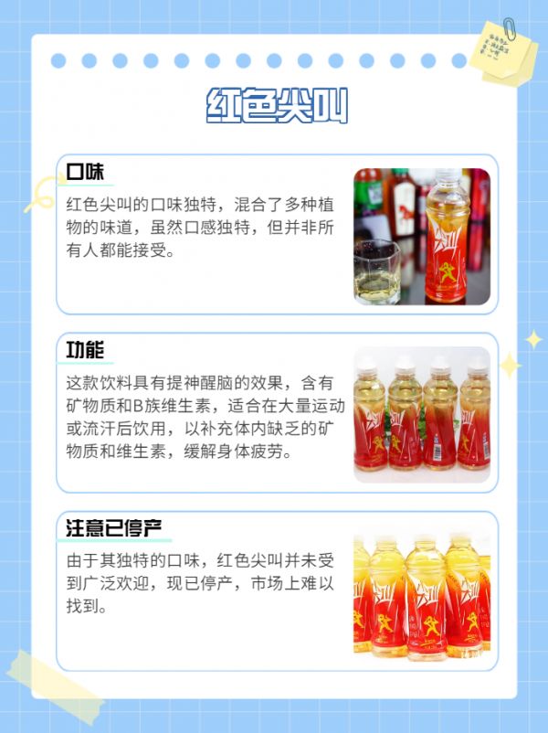 紅色尖叫(已停產(chǎn))口味:多種植物混合的味道功能:具有提神醒腦的效果,含有礦物質(zhì)和B族維生素,可以補充身體的礦物質(zhì)和維生素,緩解身體疲勞或睡眠不足引起的大腦疲勞。適合大量運動或流汗后飲用,補充體內(nèi)缺乏的礦物質(zhì)或維生素。注意:由于口味獨特,并非每個人都能接受,現(xiàn)已停產(chǎn)。