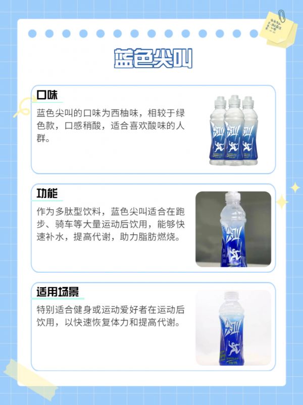 藍色尖叫口味:西柚味,比綠色款稍酸功能:屬于多肽型飲料,適合在跑步、騎車等大量運動后快速補水,還能提高代謝,助力脂肪燃燒。適用場景:適合健身或運動愛好者在運動后飲用。