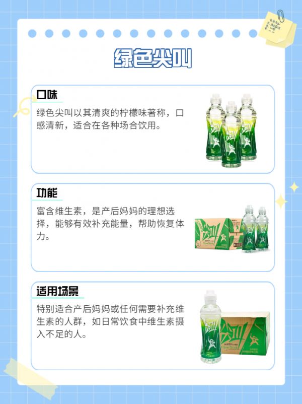 綠色尖叫口味:清爽的檸檬味功能:富含維生素,是產(chǎn)房的必備好物,能為媽媽們補充能量。適用場景:適合產(chǎn)后媽媽或需要補充維生素的人群。