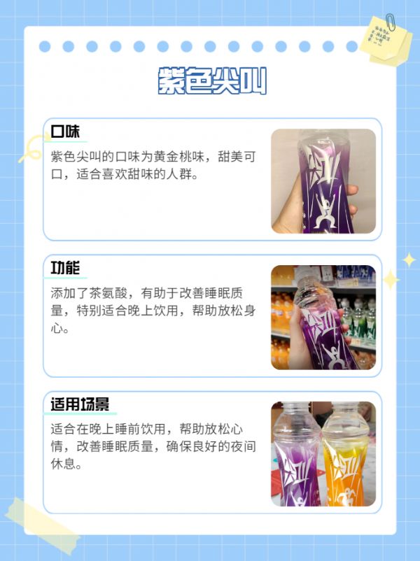紫色尖叫口味:黃金桃味功能:添加了茶氨酸,有助于改善睡眠質(zhì)量,晚上想睡個好覺可以喝。適用場景:適合晚上睡前飲用,幫助放松身心,改善睡眠。