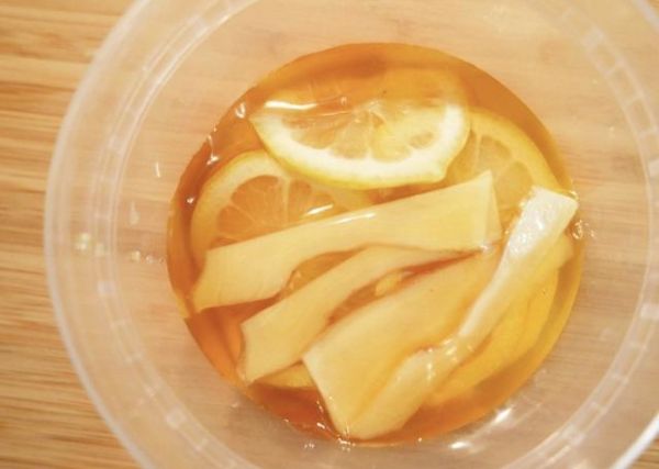 3、然后密封好放到冰箱靜置3天,3天之后就可以泡水喝了。喝的時(shí)候舀上兩勺,夾上兩片檸檬和姜片,用溫水沖泡開即可飲用。