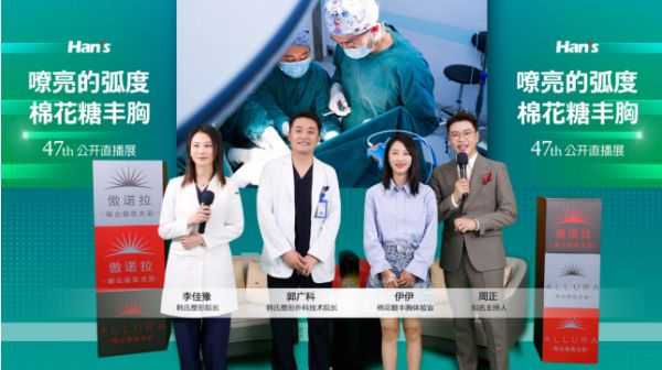 在手術(shù)過程中,受術(shù)者放聲歌唱,展示出術(shù)中幾無出血的特點(diǎn),也讓原本冰冷的手術(shù)室顯得更加“有溫度”。韓氏整形外科醫(yī)院總院長張鑫萌與副總經(jīng)理米若溪先后對于棉花糖豐胸直播的特點(diǎn)和內(nèi)容進(jìn)行了詳細(xì)的講解,同時不斷與手術(shù)室進(jìn)行互動連線,為全體觀眾展現(xiàn)了從精準(zhǔn)麻醉到剝離,最后到手術(shù)結(jié)束的全過程,與全國觀眾共同見證了整形美容行業(yè)的技術(shù)進(jìn)步和成果。