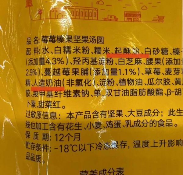 除此之外,配料表出現(xiàn)的人造奶油、植物黃油、氫化植物油、起酥油等反式脂肪酸需要引起重視,建議少買或不買。
