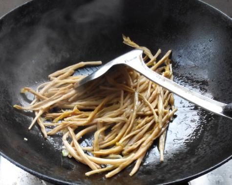 將鍋清洗干凈后加熱,加入豬油燒熱,融化后加入蔥段煸炒出香味。隨后將泡發(fā)的黃花菜加入鍋中,翻炒一段時間。