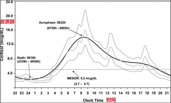 皮質(zhì)醇分泌具有晝夜節(jié)律性。早晨8點(diǎn)左右皮質(zhì)醇水平最高,下午時(shí)它就會(huì)下降,最低點(diǎn)大約在凌晨2點(diǎn)。