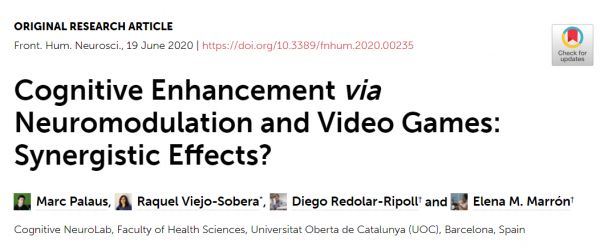 Palaus M, Viejo-Sobera R, Redolar-Ripoll D, Marrón EM. Cognitive Enhancement via Neuromodulation and Video Games: Synergistic Effects?. Front Hum Neurosci. 2020;14:235. Published 2020 Jun 19.