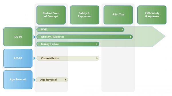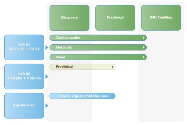 目前,Rejuvenate Bio 公司有三條關(guān)于人類(lèi)的研發(fā)管線,其中 RJB01(FGF21+sTGFβR2)進(jìn)展最快,目前正在進(jìn)行臨床試驗(yàn)申請(qǐng),用于治療人類(lèi)的心血管疾病、代謝疾病,以及腎病。RJB01(αKlotho+sTGFβR2)具體信息尚未公布,還有一款逆轉(zhuǎn)年齡的療法,用于治療慢性年齡相關(guān)疾病。