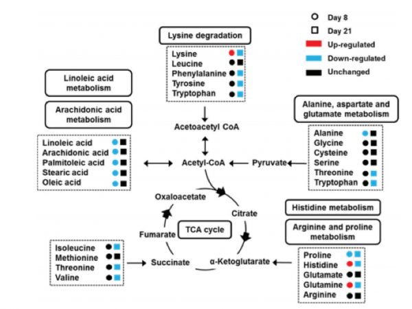 GOS仔豬中與肝臟脂肪酸和氨基酸代謝相關(guān)的重要代謝物和主要代謝途徑