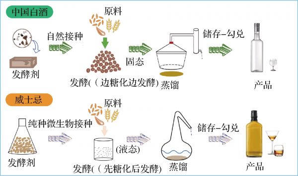 圖1 中國(guó)白酒發(fā)酵傳統(tǒng)工藝與威士忌發(fā)酵工藝的比較
