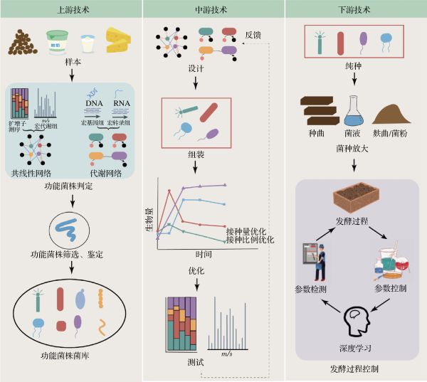 上游技術(shù)的主要目的在于傳統(tǒng)發(fā)酵體系中微生物菌群解構(gòu)(組成、結(jié)構(gòu)、功能),菌種的安全、發(fā)酵性能的評(píng)價(jià)。同時(shí)分離獲取菌種,構(gòu)建核心功能微生物菌種數(shù)據(jù)庫(kù),為中游核心功能微生物菌群的重構(gòu)提供組裝依據(jù)和菌種。