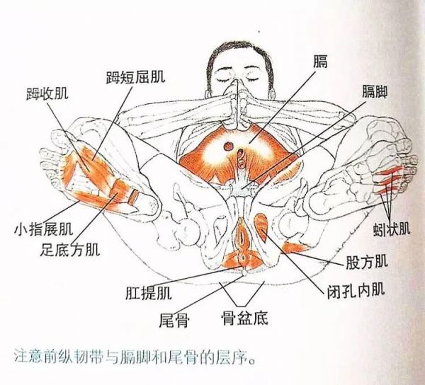 骨盆底:閉空內(nèi)肌、肛提肌。梨狀肌,閉孔外肌,上、下孖肌,股二頭肌,半腱肌,半膜肌,大收?。ㄩL(zhǎng)頭)等長(zhǎng)收縮。兩條腿應(yīng)該保持緊張,否則深度的屈曲會(huì)造成髖關(guān)節(jié)失去縱向穩(wěn)定性,并使得骨盆底的活動(dòng)更困難。