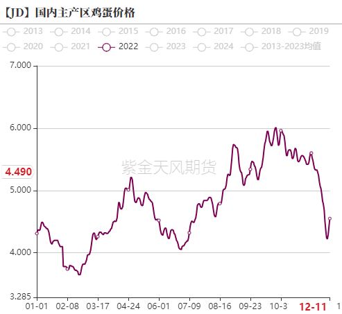 進(jìn)入四季度,雞蛋現(xiàn)貨價(jià)格在10月初開(kāi)始震蕩走高,到月底觸及6元關(guān)口,11月初現(xiàn)貨價(jià)格開(kāi)始窄幅偏弱震蕩,進(jìn)入12月,現(xiàn)貨價(jià)格開(kāi)始快速下跌,月底跌至4.2元關(guān)口。四季度雞蛋的價(jià)格走勢(shì)跟生豬價(jià)格走勢(shì)較為相似,10月現(xiàn)貨價(jià)格大漲,一方面蛋雞存欄始終維持低位,加上三季度市場(chǎng)淘雞量較大,加上生豬現(xiàn)貨價(jià)格持續(xù)拉升,在供給端偏緊,需求替代增加的邏輯,市場(chǎng)囤貨意愿較強(qiáng),現(xiàn)貨價(jià)格快速上漲,但進(jìn)入11月生豬現(xiàn)貨價(jià)格已經(jīng)開(kāi)始高位回落,中下游高價(jià)拿貨去向謹(jǐn)慎,市場(chǎng)進(jìn)入去庫(kù)存節(jié)奏,現(xiàn)貨價(jià)格逐步回落,月末疫情防控結(jié)束,疫情感染人群蔓延全國(guó),外出活動(dòng)減少,企業(yè)停工停產(chǎn)增加,需求呈現(xiàn)斷崖式下滑,生豬雞蛋價(jià)格開(kāi)始暴跌。期貨方面,四季度期貨合約JD2211以及JD2212從9月初開(kāi)始持續(xù)上漲,一方面是因三季度遠(yuǎn)期合約因需求預(yù)期悲觀被低估,9月之后現(xiàn)貨價(jià)格雖然區(qū)間震蕩,但期貨持續(xù)補(bǔ)漲,進(jìn)入10月跟隨現(xiàn)貨價(jià)格上漲,11月現(xiàn)貨價(jià)格雖然走弱,但春節(jié)需求旺季預(yù)期支撐期貨持續(xù)走高,進(jìn)入12月跟隨現(xiàn)貨價(jià)格大跌。