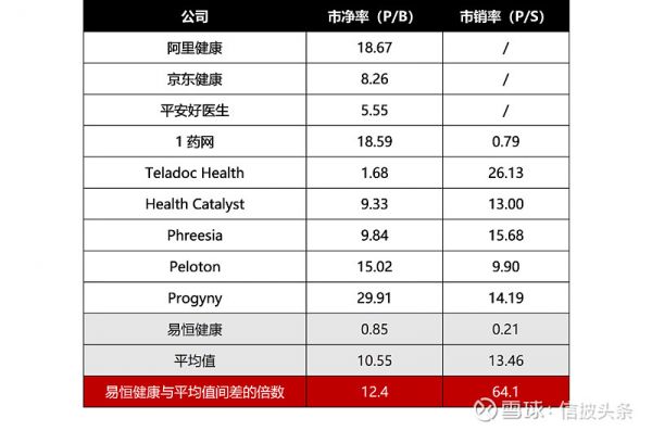 本文選取了10家在美股、港股上市的互聯(lián)網(wǎng)大健康領域頭部公司,包括阿里健康、京東健康、平安好醫(yī)生、1藥網(wǎng)、易恒健康、Teladoc Health、Health Catalyst、Phreesia、Peloton和Progyny。根據(jù)5月1日收盤數(shù)據(jù)對比可以看出,易恒健康的P/B、P/S僅是互聯(lián)網(wǎng)大健康公司平均值的1/12.4和1/64.1。由此可見,易恒健康目前處于估值洼地,未來有較大增長空間。(數(shù)據(jù)來源:WIND、雪球、公司年報)
