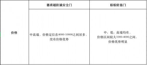 走高端路線的德盾超防撬安全門所用材質都很講究,優(yōu)質的材質成本都相對較高,所以德盾超防撬安全門市場價格一般偏高,每扇門的價格定位在4000-10000之間居多。而盼盼防盜門主要以工程門為主,生產(chǎn)線和門的種類很多,中低高端均有,價格可選空間多。
