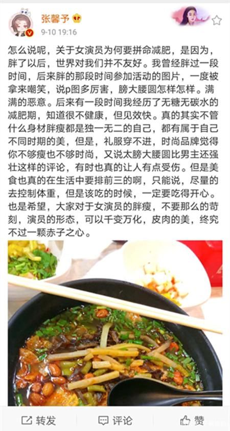 9月10日,張馨予在社交平臺(tái)曬美食,并發(fā)文談女演員拼命減肥的原因,她的觀點(diǎn)很真實(shí)。對(duì)于娛樂(lè)圈中女演員或明星來(lái)說(shuō),顏值對(duì)她們來(lái)說(shuō)至關(guān)重要,顏值不僅包括五官,更重要的還有身材。如果身材管理不好,對(duì)顏值也會(huì)大打折扣。