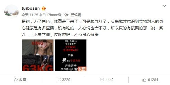 1905電影網(wǎng)訊 9月6日,孫儷在微博曬出鄧超為拍《影》增重又減肥的食譜和照片,并發(fā)文稱:“是的,為了角色,體重是下來(lái)了,可是脾氣漲了,后來(lái)我才意識(shí)到食物對(duì)人的身心健康是有多重要,沒有吃的,人心情也會(huì)不好,所以真的有餓哭的那一說(shuō),所以……不要學(xué)他,過度減肥,不益身心健康?!?/p>孫儷微博發(fā)文:不要學(xué)鄧超過度減肥