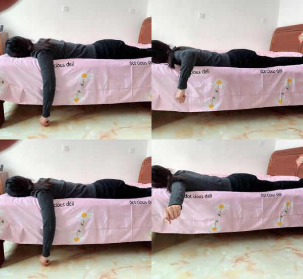 2.鐘擺運(yùn)動(去掉支具后進(jìn)行,如有腰部疾患,改為俯臥床上,雙手在床外):健側(cè)手臂托住患肘,彎腰90°背部與地面平行,患側(cè)手臂放松,進(jìn)行患肩前后左右被動擺動,每個方向活動至微痛角度即可換方向。10個/組,2-3組/天。